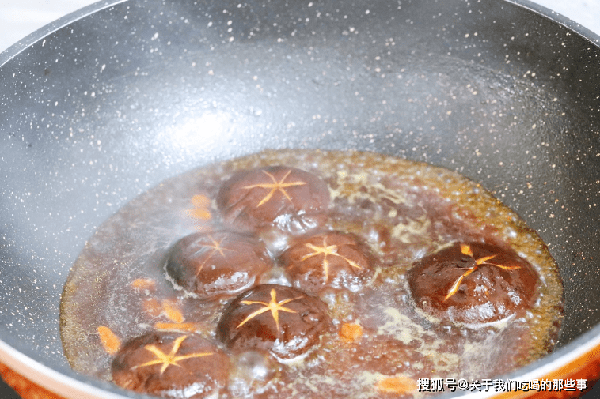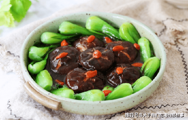 3、淋入適量水淀粉勾芡,湯汁濃鬱後撒上枸杞,把香菇放在盤子中間,再把湯汁淋在香菇和油菜上即可。