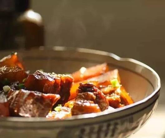 3.加入剛才煮肉後的湯,倒生抽老抽,下蔥段、薑片、花椒大料,大火開鍋後轉小火,蓋蓋兒燉50分鐘左右,把土豆塊放入,繼續燉至肉酥爛,最後調入雞精,出鍋。