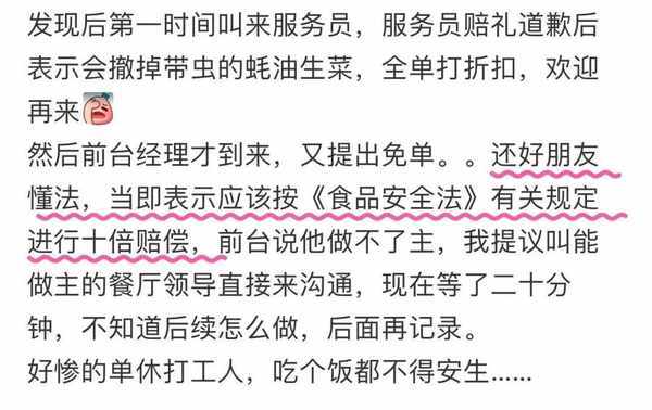 該網友拒絕瞭經理的免單,要求按“食品安全法”有關規定,進行十倍賠償。