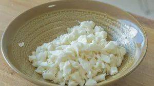 山藥兩根,洗凈削皮,然後用刀拍碎,顆粒比較大的話再用刀剁一下,剁成這種小顆粒就行瞭,裝入碗裡。