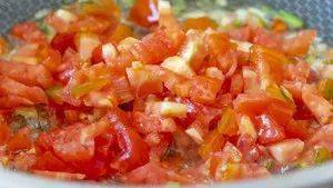 繼續起鍋倒油,加蔥蒜爆香,然後倒入西紅柿丁,加一勺鹽更容易出汁兒,大火繼續翻炒。