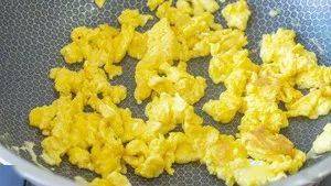 起鍋倒油,倒入蛋液,蛋液開始凝固的時候用筷子滑散,可以多煎一會兒,個人覺得雞蛋煎老一點會更香,煎好後先倒出來。