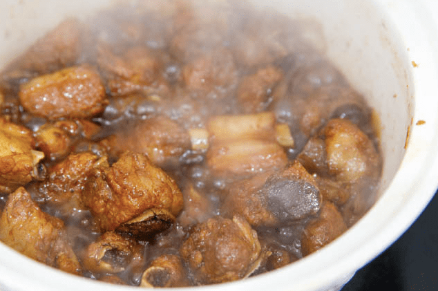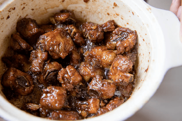 時間到之後打開蓋子,把裡面的調料都挑出來去掉,開大火收汁最後加少許陳醋,收到差不多幹就可以出鍋瞭,如果你有白芝麻的話可以撒一點上去裝飾一下即可。