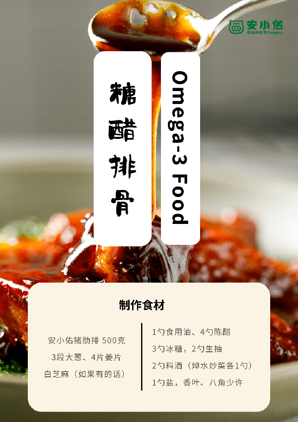 使用安小佑Omega-3豬肋排制作的糖醋排骨酸甜適中,不油不膩,口感豐富細膩,不僅好吃,更有極高的營養價值哦。醋酸可以使排骨中鈣、鎂的後產生醋酸鈣,可以更好地被人體吸收利用,因而糖醋排骨可以提高煮排骨的營養吸收率,非常適合給老人孩子補充營養。最重要的是,糖醋排骨不濃不淡,酸甜可口,就算是拿汁水拌米飯也是一樣好吃。