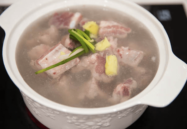浸泡到時間後把豬肋排抓洗幹凈,起鍋倒水,冷水下入排骨,加入適量的蔥段跟薑片和1勺料酒,開大火把水煮開,下入排骨焯水,水開之後撇去表面的浮沫,再煮2分鐘。時間到撈出來放入溫水中沖洗幹凈。不要用冷水,會讓肉驟縮,吃著發柴。然後撈出來備用。
