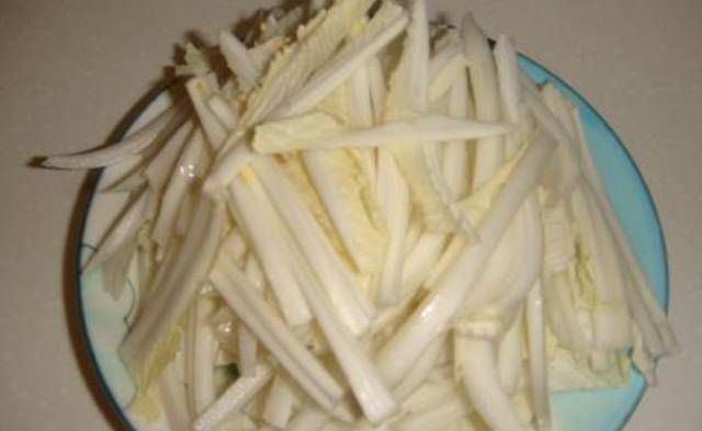 將白菜去掉幹部之後再切白菜的時候,大傢需要註意將白菜葉和白菜幫翻開來切,白菜幫切成細絲,而白菜葉撕成片狀。