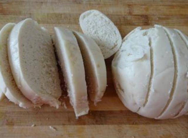 然後我們在切饅頭的時候,刀的兩面蘸上適量的清水,將饅頭切成一厘米左右的薄片。