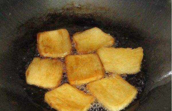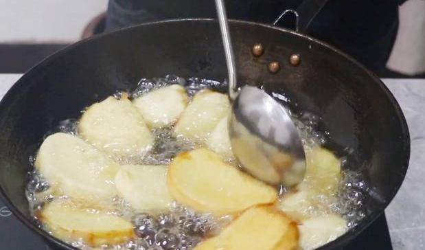鍋中放入適量的食用油,當油燒至6成熱的時候我們將饅頭片在淀粉水當中蘸一下,然後放進油鍋當中炸一下,一直炸至酥軟。