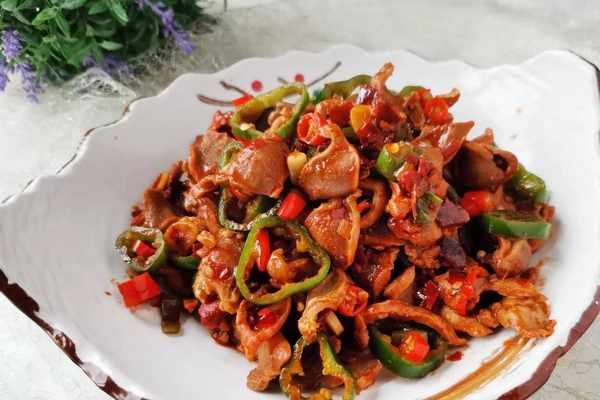 4.加清水燒沸,將火調至成中火,燒約5分鐘後,加入雞心繼續燒約5分鐘,最後加雞肝、洋蔥圈、黃瓜條、萵筍條、芹菜段入鍋中炒翻均勻,再燒7-8分鐘,待鍋中湯汁收濃亮油時即可關火,撒上香菜,直接就用炒鍋盛上桌後即可食用。