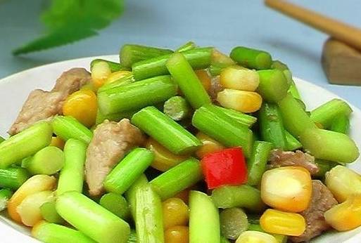 食材:蒜苔、熟玉米粒、豬肉、紅椒、蔥、蠔油、生抽、淀粉、料酒、鹽