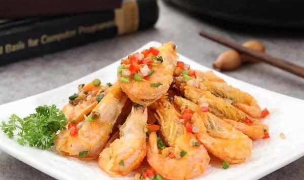 4、倒掉油後的鍋,加熱放入蝦,撒上椒鹽攪勻,然後加入青椒碎末和炸好的蒜蓉,翻炒幾下就可以出鍋瞭。