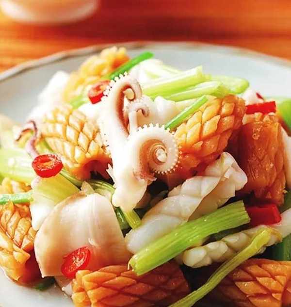 食材:鮮魷魚200g、西芹100g、紅甜椒50、薑3片、鹽2g、糖5g、檸檬汁5ml、料酒5ml、芝麻油5ml、辣豆豉5g