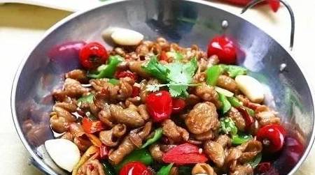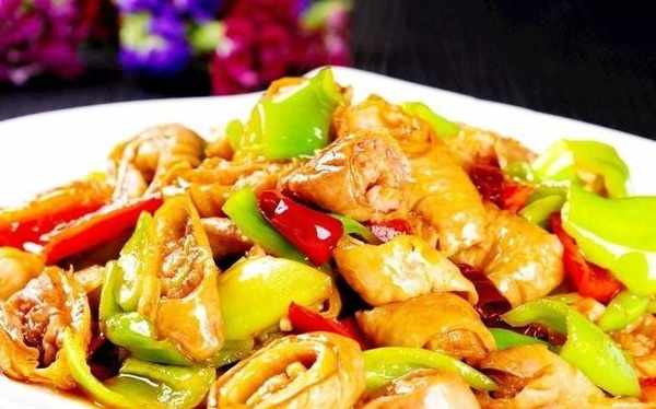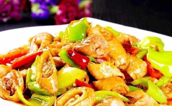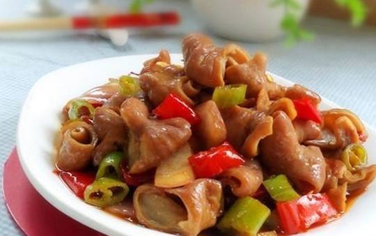 食材:肥腸400克、尖椒3個、大蒜、植物油、料酒、醬油、水淀粉、胡椒粉、精鹽、味精