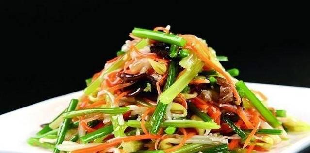 3.按順序炒荷蘭豆、雪菜、黃豆芽、芹菜、胡蘿卜,加熱水翻炒,加食鹽、白砂糖、雞精出鍋