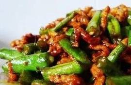 3、鍋內留底油燒熱,放入蔥、蒜、薑、紅辣椒熗鍋,放入肉片煸炒至色白時,放入黃醬、料酒炒出香味,放入豆角,加白糖、精鹽、少許水炒熟,加雞精、五香粉炒勻,用濕淀粉勾芡出鍋裝盤即成。