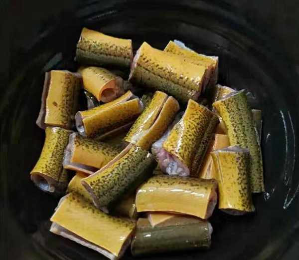 (1)鱔魚處理幹凈以後,平放在菜板上,剁成小段兒