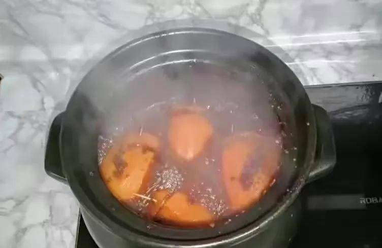 (4)然後準備一口深一點的鍋,註入清水,放入剩下的50克紅糖,10克冰糖,再把蓮藕丟進去,水開後轉小火煮1個小時