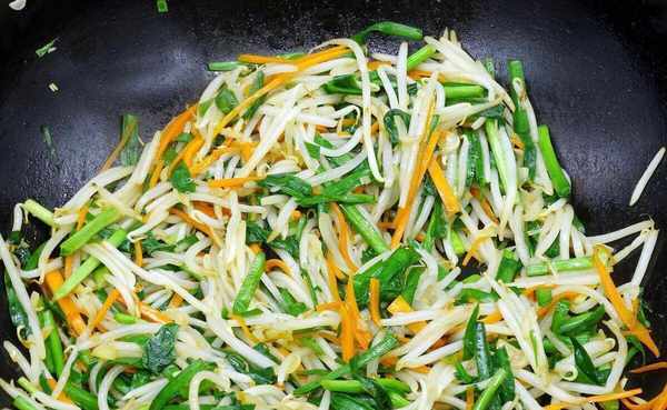 (3)鍋裡倒油,先放蔥花炒出香味,再倒入胡蘿卜炒至斷生,接著放豆芽,韭菜,這些比較容易炒熟,翻炒1分鐘即可