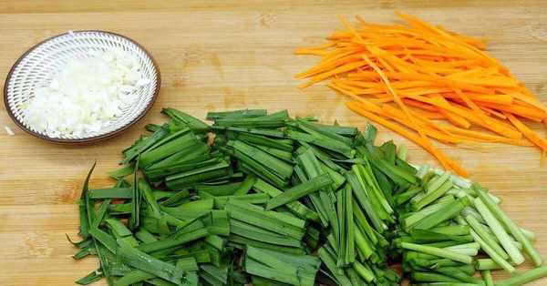 (1)半根胡蘿卜切成細絲兒,香蔥切碎,韭菜切小段
