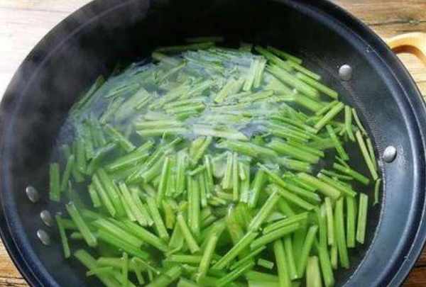 在浸泡的過程當中,我們在處理芹菜,將甜菜摘去葉子之後清洗幹凈切成小段,然後鍋中放入適量的清水,大火燒開之後,將切好的芹菜放進鍋中,焯水一分鐘左右,將芹菜撈出控幹水分。