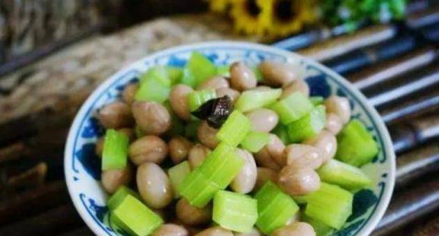 然後我們將泡在大量水當中的花生煮,15分鐘左右就可以撈出來瞭,將煮好的花生加入到芹菜裡邊,最後加入適量的香油攪拌一下,就做成瞭非常美味的涼拌花生米瞭。