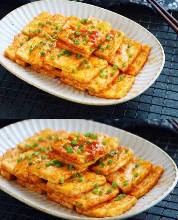 步驟三:平底鍋稍微多留一點底油,油熱後放入豆腐塊,文火慢煎至表皮微微發黃即可。時間不可太長瞭,不然豆腐口感就不好瞭;全部煎好之後,倒入調好的醬汁,煮開收幹湯汁即可;出鍋之後撒點蔥花;這樣超級美味的鍋包豆腐就做好瞭;酸甜可口,超級開胃,孩子也喜歡吃