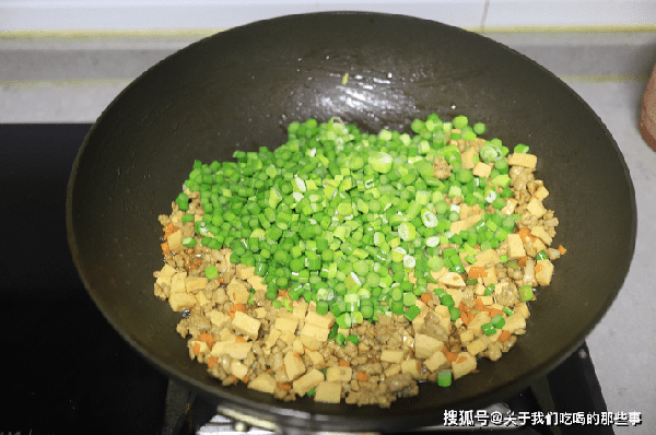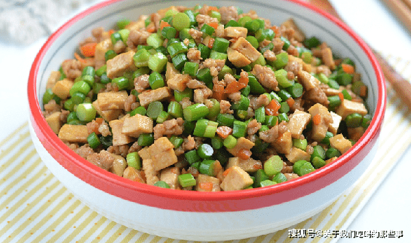 1、五花肉洗幹凈,切成肉末。豆幹、蒜薹、胡蘿卜洗幹凈,豆腐切成黃豆大小的丁,蒜薹切小段,胡蘿卜切碎丁;