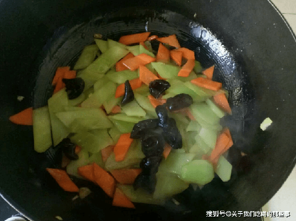 2、起鍋燒油,放入蔥薑爆香,倒入萵筍、胡蘿卜,大火翻炒一會兒,斷生後倒入黑木耳,繼續炒一會兒。食材都炒熟後,加入適量食鹽、生抽、雞精,大火翻炒均勻,即可關火出鍋。