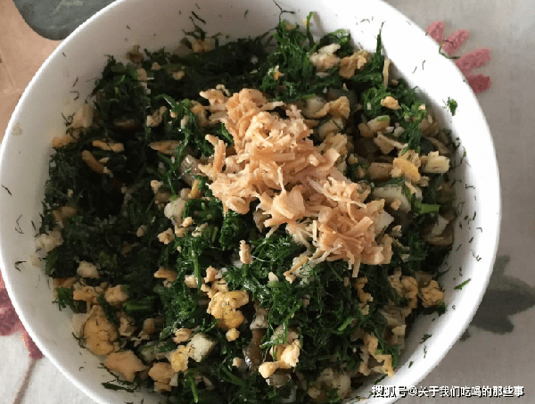 2、茴香洗幹凈,瀝幹水分後切成碎末,放入大碗中,加入炒好的蝦皮、雞蛋塊,放入適量食鹽、香油,攪拌均勻即可。