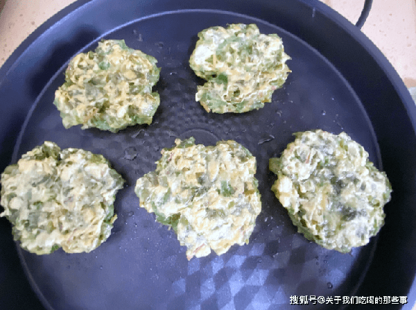 2、把馬齒莧用刀切碎,放入盆子裡,加入2個雞蛋,一大勺面粉,再放入適量鹽,用筷子攪拌成濃稠的糊狀。電餅鐺倒入油,提前預熱,倒入攪拌好的面糊,用鏟子整理成圓餅。