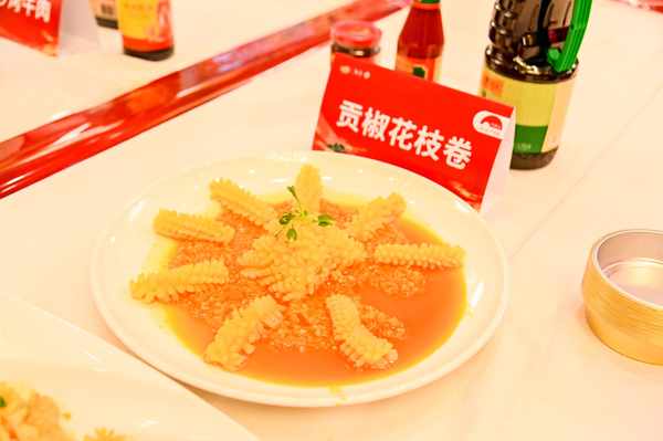 ③ 將熬制好的黃貢椒醬淋在花枝卷上即可。