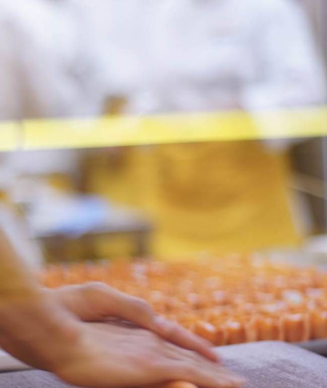 剛落座就能看到,全透明的操作間裡站滿瞭點心師傅,馬不停蹄熱火朝天的在做著港式點心。