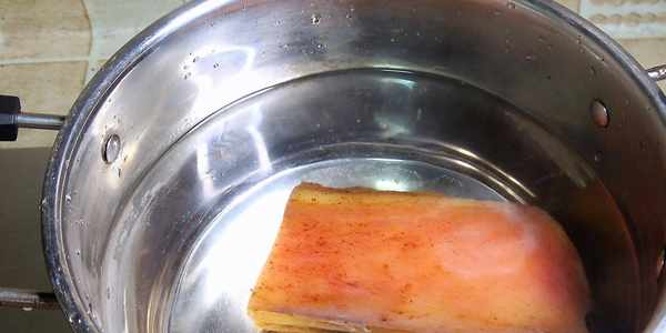 然後把臘肉冷水下鍋煮30分鐘,肉一般都要煮過再用來炒,一則是去掉一些咸味,二則是讓炒出來的臘肉沒有那麼硬。以前在老傢的時候,臘肉的皮還要先用火燒焦,然後刮掉之後再放進鍋裡煮,這樣就不會有腥味。但是現在條件不允許,加上我醃制的時候加瞭一些其他的輔料,所以豬皮不燒也是可以的。