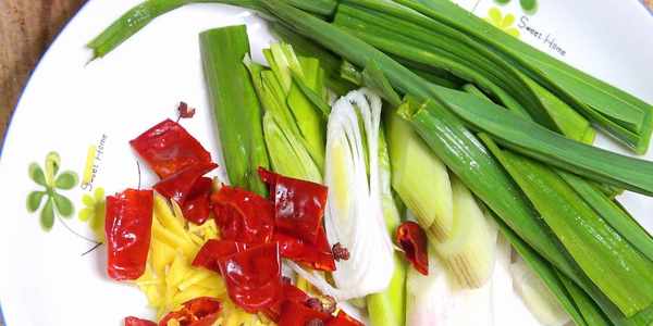 接著切一根蒜苗,根部的地方切成薄片,這樣更容易熟,炒紅菜苔加蒜苗是非常香的。再切一點薑絲,準備一點幹辣椒段增香,一點幹花椒備用。