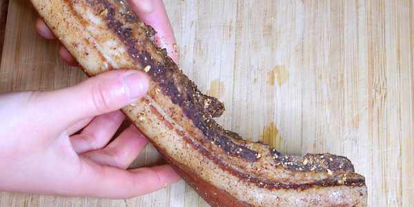 接著準備一塊臘肉,很多朋友不知道臘肉曬幹後怎麼吃,今天就用它來炒紅菜苔,這個做法也是四川的特色做法。切一小塊下來就可以瞭,畢竟現在豬肉太貴啦。接著把臘肉用熱水清洗幹凈,上面的調料也一並清洗幹凈。