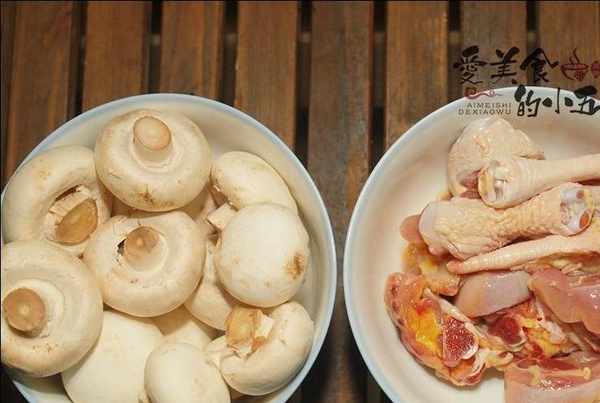 1.準備好新鮮的蘑菇與雞腿,蘑菇切除根部,雞腿斬成大塊。