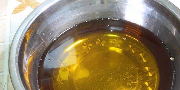 接著鍋裡倒入500克菜籽油,做花椒油最好是用菜籽油,這樣做出來的花椒油才會更香。生菜油一般都有一股難聞又難吃的生菜油味,去除這個味道很簡單,直接先用大火把菜油燒開,也就是把它燒到鍋裡的煙在往上冒的時候就可以瞭。燒開的菜籽油是聞不到一點生菜油的氣味的。然後關火,把它放涼至3成熱,大約需要5分鐘。然後把放涼後的菜籽油倒入大碗裡備用。