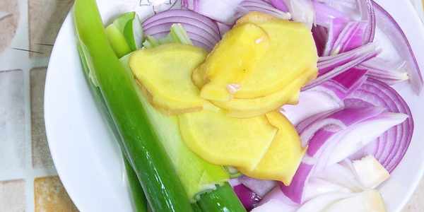然後再準備一點輔料,半個洋蔥切成厚厚的絲備用。一點大蔥從中間切開,方便更好地出味。再切幾片生薑備用。