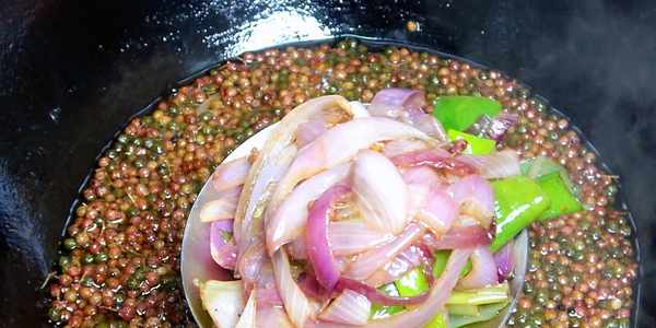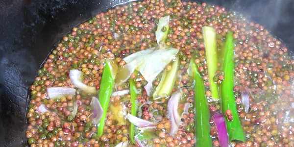 接著鍋裡加入小半碗清水,把泡好的花椒倒入鍋裡,先用少量的水來煮一下花椒,把花椒煮脹,這樣更利於花椒出味,而且在這個過程中,白酒也就揮發瞭。煮到花椒明顯發脹,並且沒有什麼水分的時候就把剛才的菜籽油倒進來,把生薑大蔥和洋蔥也一起放進來,用中小火熬制,這樣花椒和輔料才不會糊。