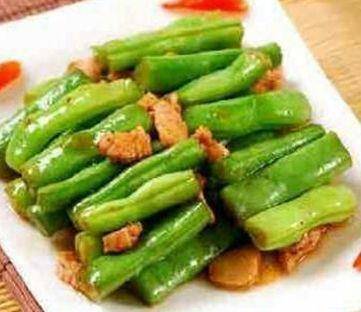 材料:四季豆500克,豬裡脊肉100克,大蒜2克,黑胡椒10克,白糖15克,醬油5克。