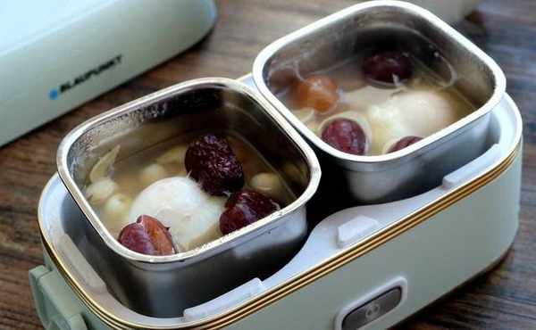步驟3:電熱飯盒裡加上足量的水,裝好食材的小盒放裡面,扣好蓋子,通電,加熱30分鐘。如果用小碗蒸,放到蒸鍋裡,水開後中火蒸30分鐘;