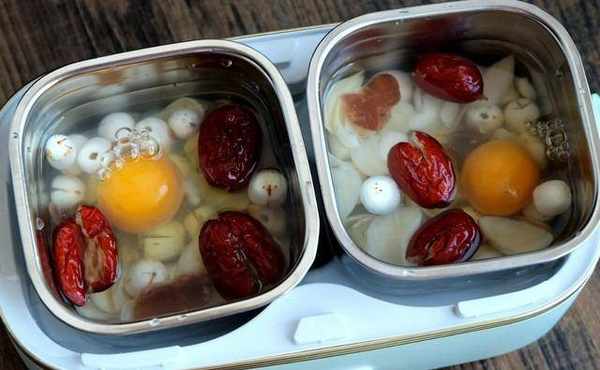 步驟4:時間到,打開蓋子,蓮子已經燉得糯糯的瞭,雞蛋也熟透瞭,湯裡混合著蓮子百合的清香,又有紅棗桂圓的香甜,浸泡在裡面燉熟的雞蛋也是特別好吃,真沒想到,這個燉品味道這麼好,而我以前居然沒有想過要這樣做!