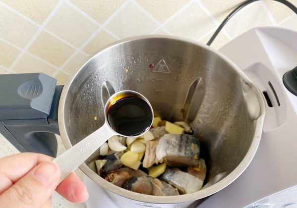5、打開蓋子,放入鮁魚段,薑絲、蒜片,加入生抽、醬油、料酒、蠔油,蓋上蓋子。