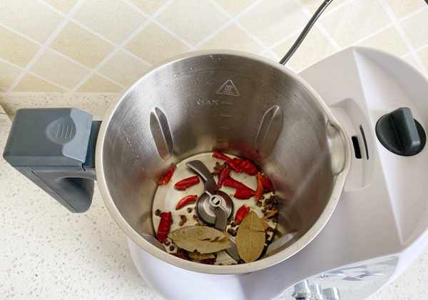 3、料理機主鍋裡,倒入植物油,放入幹辣椒、八角、香葉、花椒,蓋上蓋子。