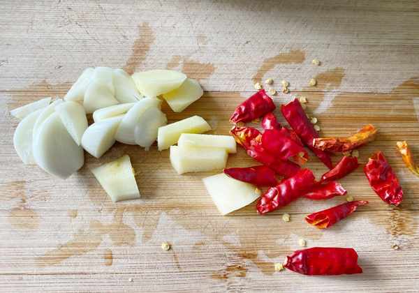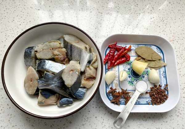 【食材】:鮁魚2條,幹紅辣椒8個,大蒜3粒,生薑1塊,香葉4片,八角4個,花椒粒2克,食鹽1小勺,生抽3勺,紅燒醬油2勺,蠔油1勺,料酒1勺,植物油30克