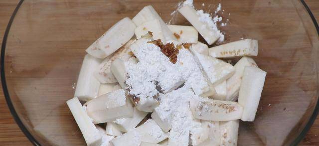 步驟三:茄子清洗幹凈,去皮後切成段,隨後切成條放盆。同時加入一勺蒜蓉醬。最後加入一勺淀粉,攪拌均勻。