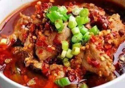 10、將煮好的肉和湯倒在蔬菜上,在上面均勻撒上幹辣椒、花椒後另起鍋燒油至180°倒在肉片上,即可。
