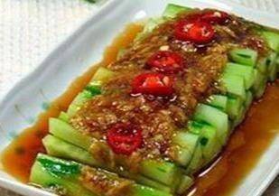 4、將黃瓜裝盤,澆入調好的碗汁,就可以享用啦。