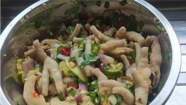 雞腳600克;百香果4個;洋蔥1個;檸檬2個;糖10克;鹽20克;料酒2勺;生抽1大勺(湯勺);小米辣8個;尖椒3個;大蒜50克;大芫荽20根