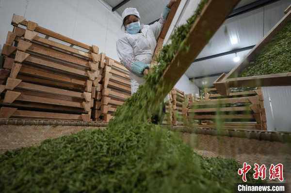 3月29日,貴州鳳岡土溪鎮一傢茶企車間正在加工的明前茶。 瞿宏倫 攝